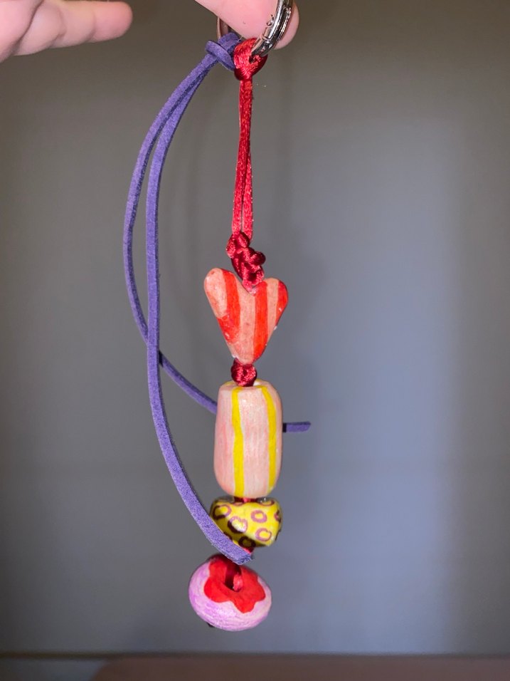 Renkli boncuklar ve kalp figürlü, bohem ve avant-garde tarzda kadın anahtarlığı. Mor kordona sahip canlı ve yumuşak tasarım. En sevdiğiniz çantaya renk katacak! İstenilen renkte tasarlanılır