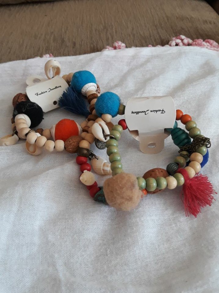 Etnik desenli, püskül detaylı renkli boncuklu bohem tarzda kadın bileklikler.