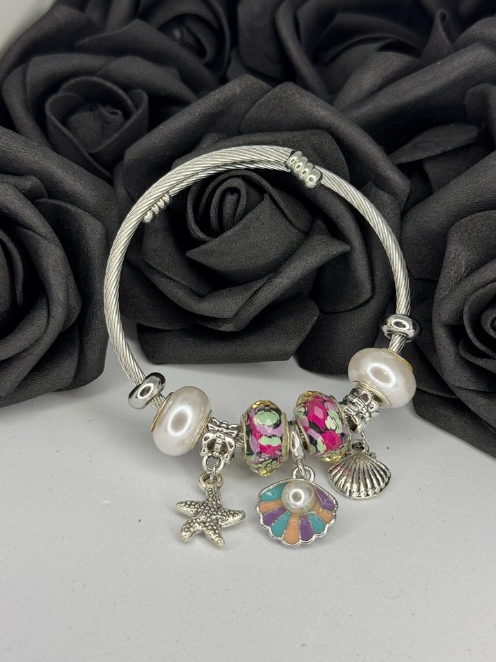 Renkli boncuklar ve deniz temalı figürler içeren bohem tarzda kadın bilekliği. İnci detayları ve şık tasarımıyla günlük kullanıma uygundur.