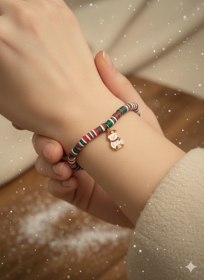 Renkli boncuklardan oluşan, nakış desenli ve küçük bir charm detayına sahip bohem tarzda rahat bir kadın bilekliği.
