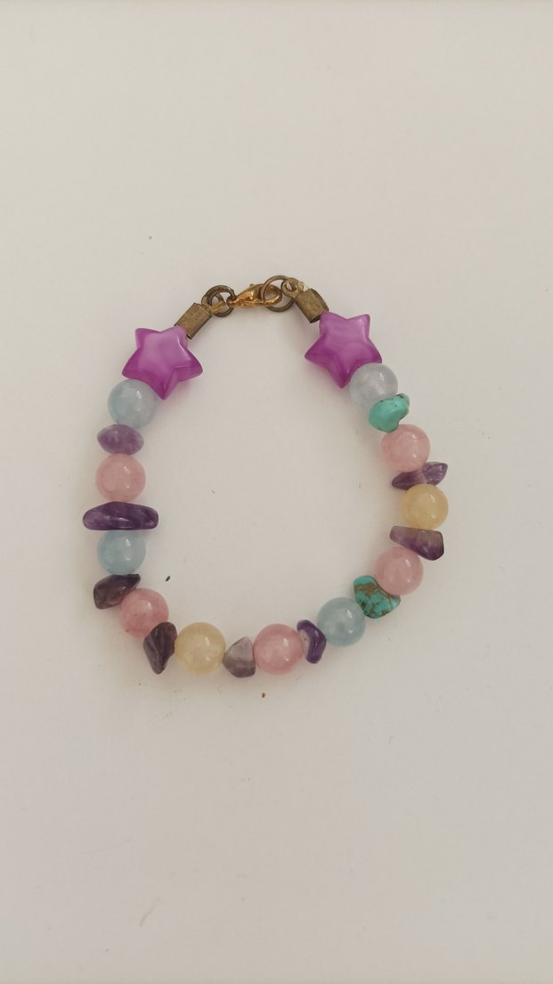 Bu bohem bileklik, yıldız şeklinde detaylar ve pastel renkli boncuklardan oluşur, romantik akşamlar için uygundur.