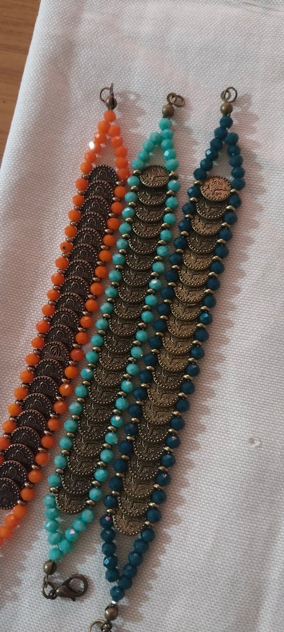 Renkli boncuklardan ve işlemeli metal detaylardan oluşan, günlük kullanıma uygun bohem tarzda bileklikler.