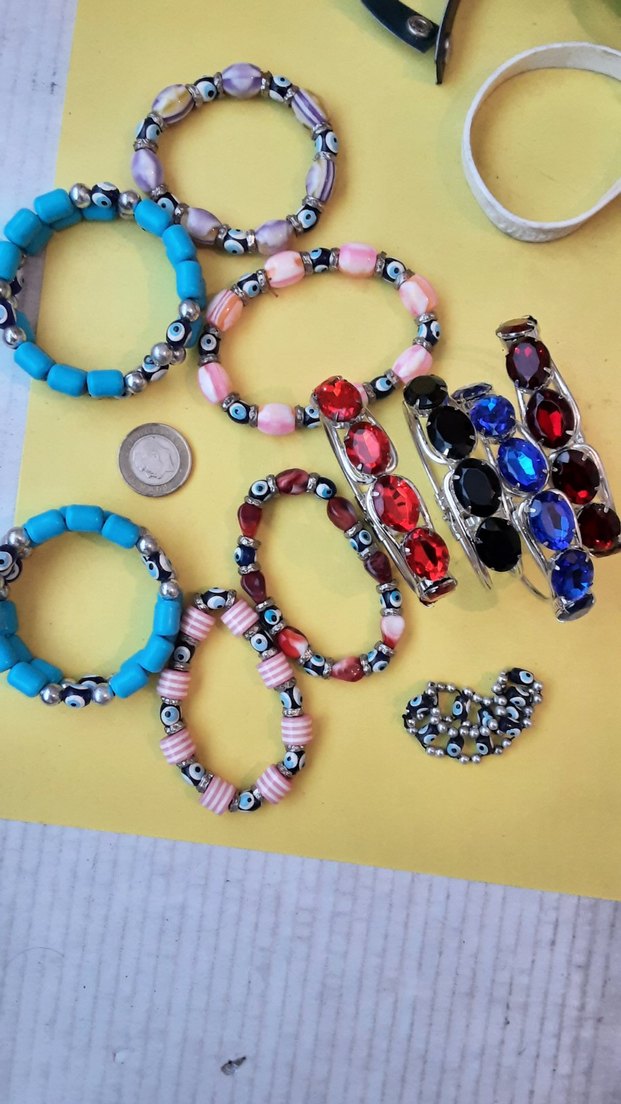 Desenli, renkli boncuklardan yapılmış bohem ve retro tarzda günlük kullanıma uygun kadın bileklikleri. Çok renkli ve canlı.