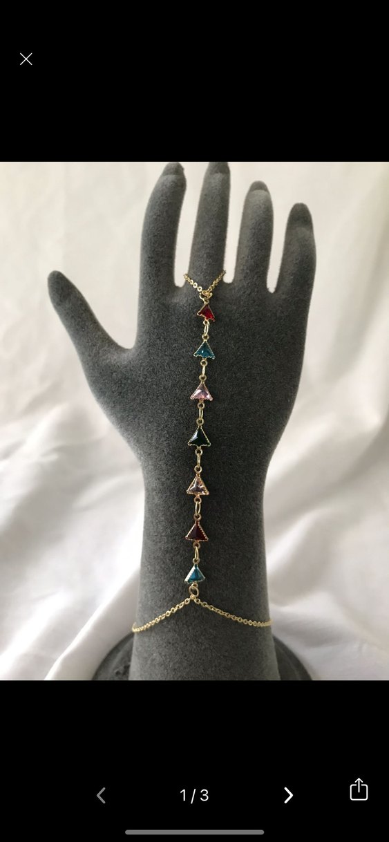 Altın renk zincir üzerinde çok renkli boncuklu üçgen figürler bulunan bohem tarzda kadın el zinciri, günlük kullanıma uygundur.