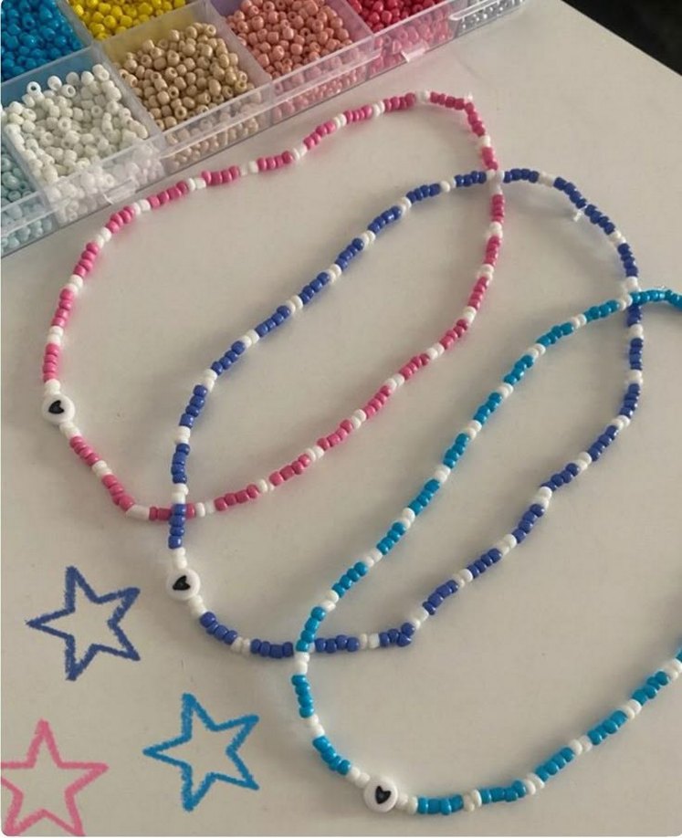 Pastel tonlarda tie-dye desenli, boncuklu ve küçük kalp detaylı bohem, retro tarzda kadın kolyesi. Hippie ve karşı kültür stiline uygun.