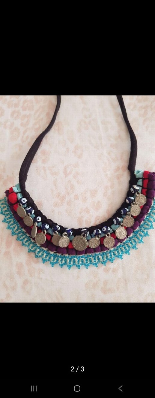Uzun boyunluk, renkli boncuklar, işlemeli desenler ve küçük para figürlü süslemeler içerir, günlük kullanıma uygundur.