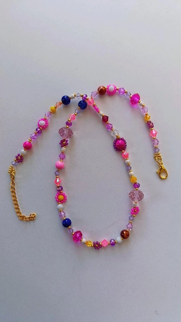 Canlı çok renkli boncuklar ve altın tonlu zincir detaylarıyla bohem tarzda renkli boncuklu kolye. kristal boncukları yansımalı parıldar şık bir kolye