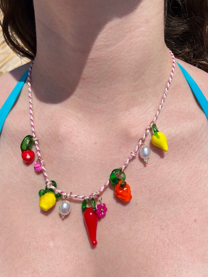 Renkli meyve ve çiçek boncuklarıyla süslenmiş, örgülü ipten yapılmış bohem tarzda parti için uygun kolye.