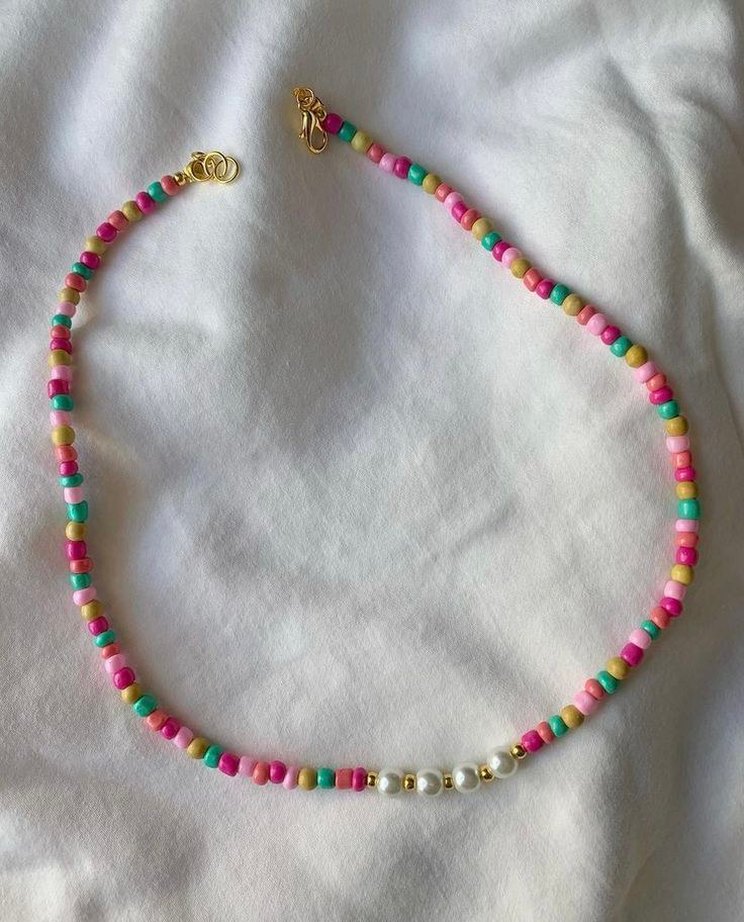 Pastel renklerde boncuklar ve inci detaylarıyla bohem tarzda, retro ve hippie görünüm için uygun bir kadın kolyesi.