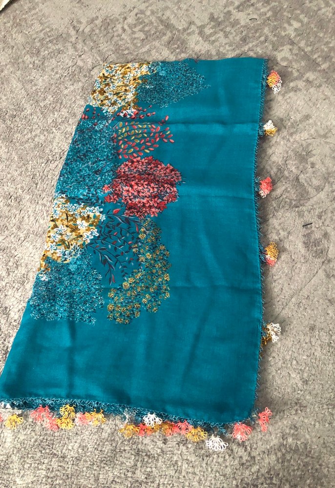 Yumuşak tekstil kumaş üzerine renkli çiçek desenleri ve boncuk detaylarıyla bohem tarzda kadın şalı. Yemeni tülbent