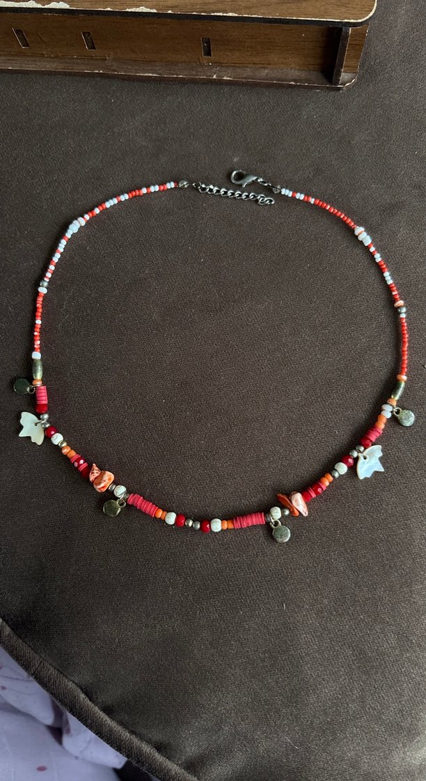 Etnik desenli, kırmızı, küçük figürlü renkli boncuklardan oluşan kısa bohem tarzı kolye.