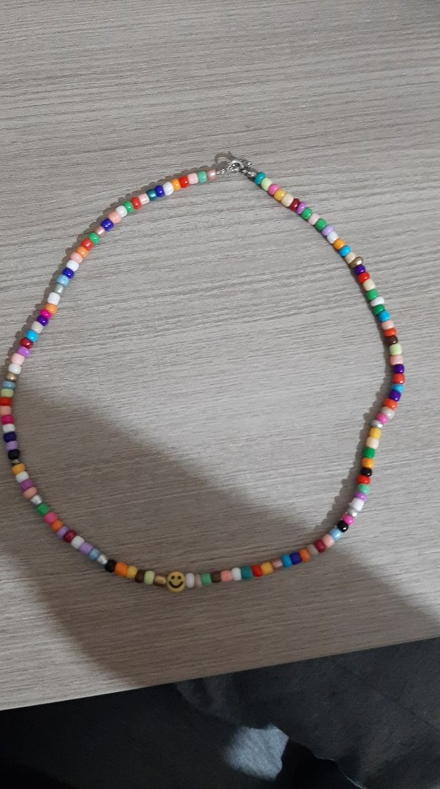 Renkli boncuklardan oluşan, tie-dye desenli ve gülen yüz boncuğu içeren bohem tarzda, günlük kullanıma uygun midi uzunlukta kolye.