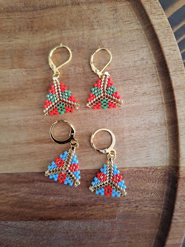 Kısa uzunlukta, renkli işleme boncuklu üçgen tasarımlı bohem küpeler, günlük kullanıma uygundur.