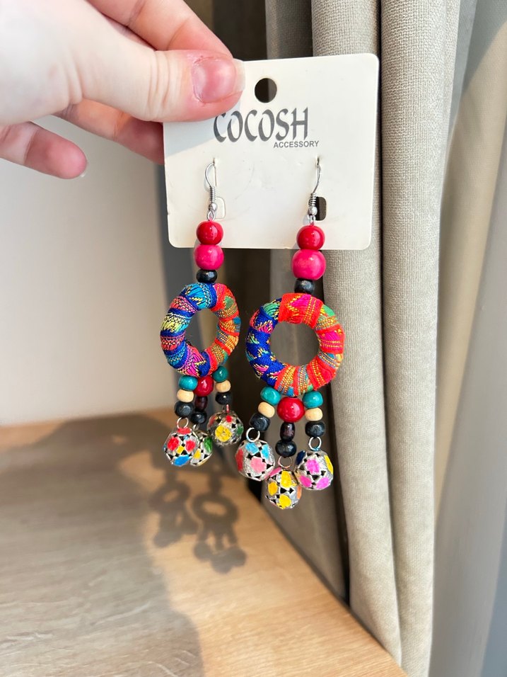 Etnik desenli, renkli boncuklarla süslenmiş bohem tarzda parti için uygun küpeler. Çok renkli boncuklar ve dairesel tasarım içerir. Çok hoş cok renkli ve tarz kadin küpesi arkadaşım hediye etti hiç kullanmadım bu yüzden satıyorum tertemiz ürün