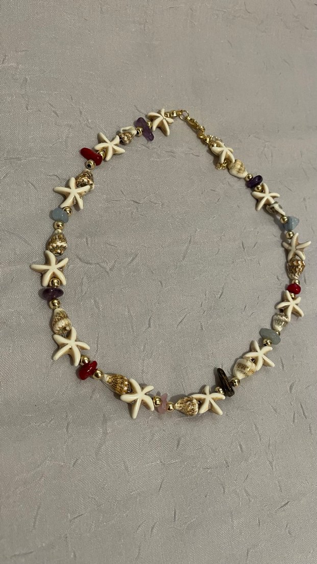Renkli boncuklar, denizyıldızı ve kabuk detaylarıyla bohem tarzda, normal uzunlukta midi kolye. Plaj için uygun, nakış desenli, retro ve hippie havasında. Kolye 110 Bileklik 65 tl İsteyene ayrı ilan açabilirim .