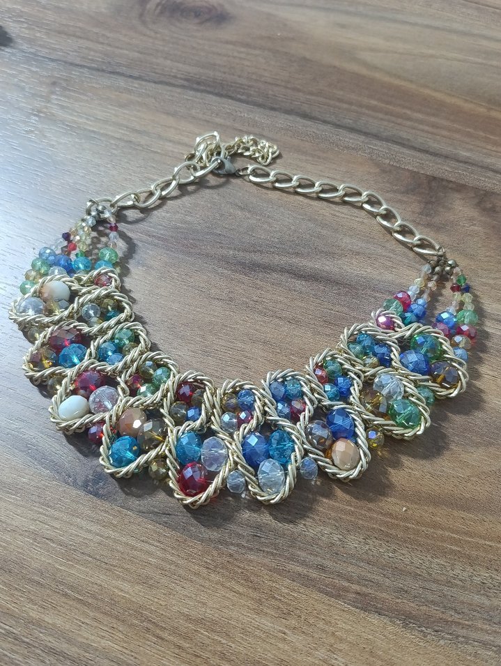Renkli boncuklar ve altın tonlu zincirle kısa uzunlukta, bohem tarzda partiye uygun kolye.
