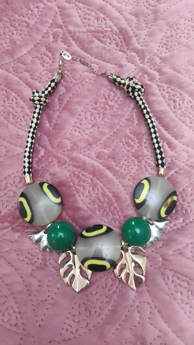 Renkli boncuklu küreler ve gümüş tonlu yaprak figürleri, desenli kordonda kısa uzunlukta bohem tarzda kolye.markasiz