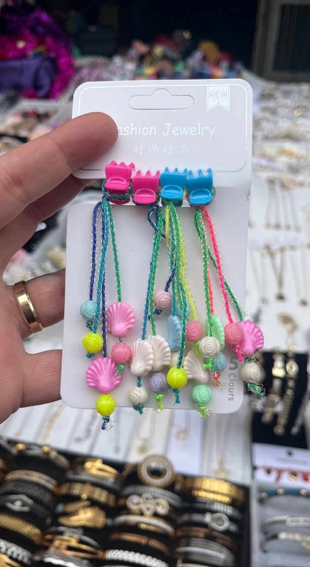 Renkli boncuklu deniz kabuğu figürlü, bağlama desenli iplerle süslenmiş bohem tarzı saç tokaları.