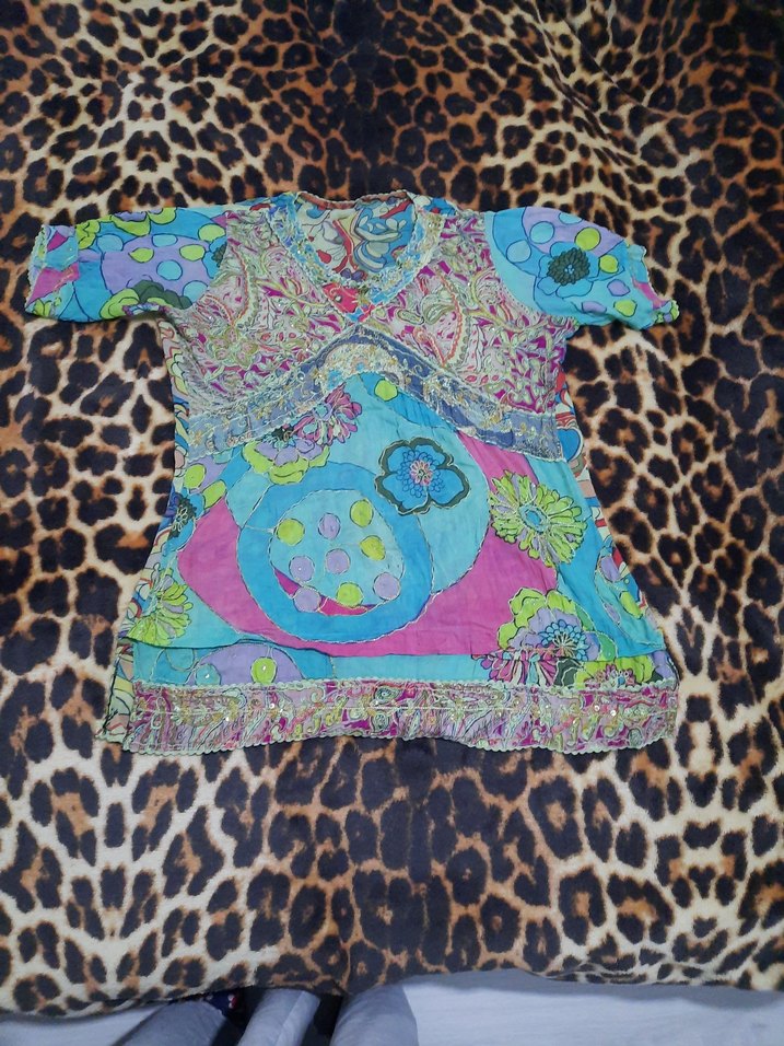 Renkli bohem desenli, boncuk işlemeli, kısa kollu, bisiklet yakalı, ince tülbent. son fotoğrafta deforme vardir ona göre alın inşallah