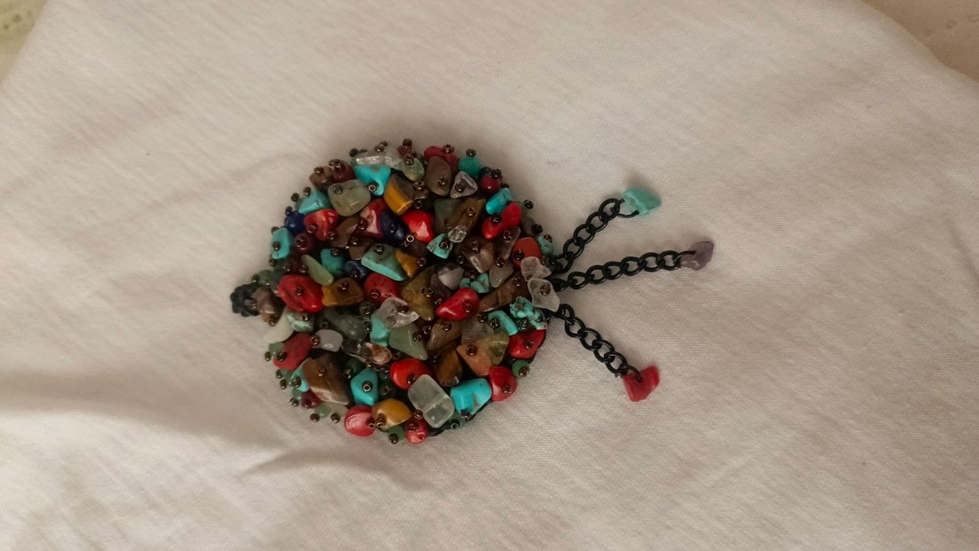 Renkli boncuklar ve nakış desenleriyle süslenmiş bohem tarzda uzun kolye, günlük kullanım için uygun.