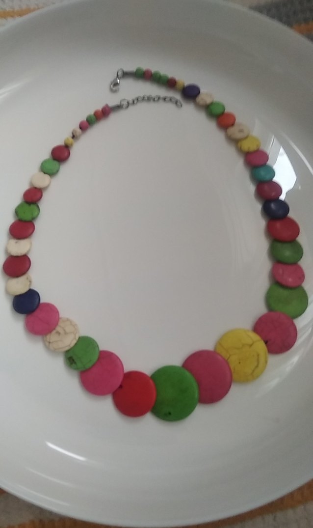 Uzun uzunlukta, renkli ve boncuklu, tie-dye desenli bohem tarzda parti için uygun bir kolye. fotoğrafta görüldüğü gibi bir tarafında minik bir değişiklik gerekiyor, kanca sağlam değil değiştirmeniz lazım