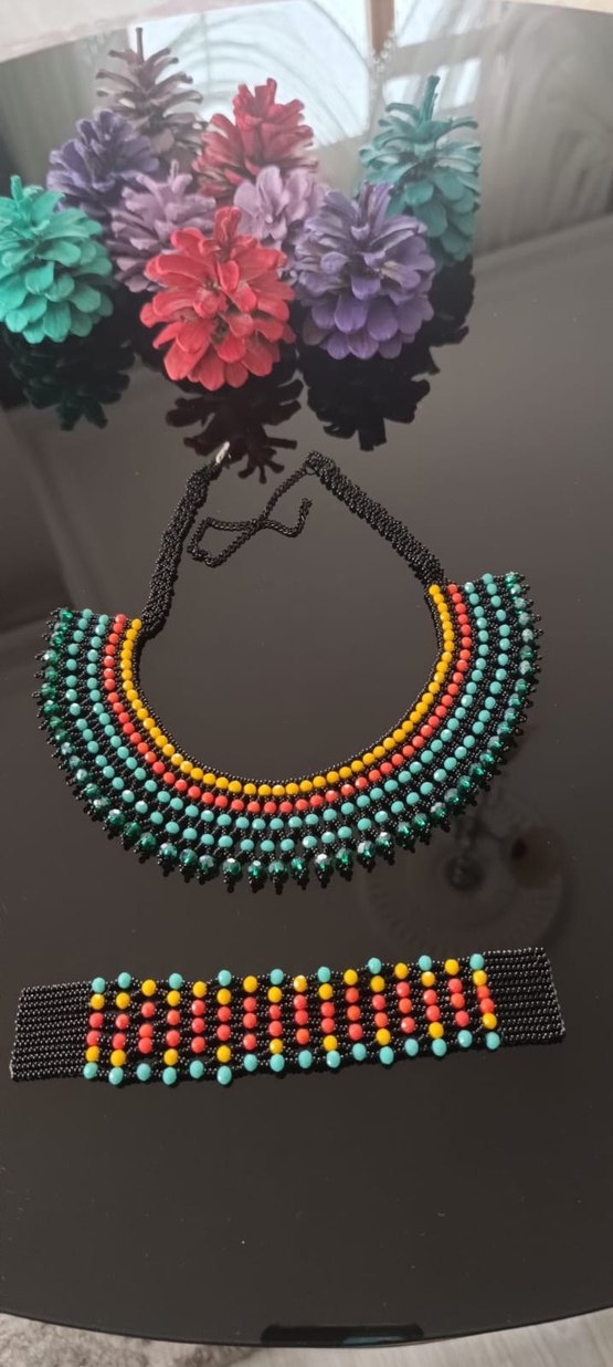 Etnik desenli renkli boncuklarla süslenmiş uzun bohem tarzı kolye. Günlük kullanıma uygun, bileklikle birlikte.