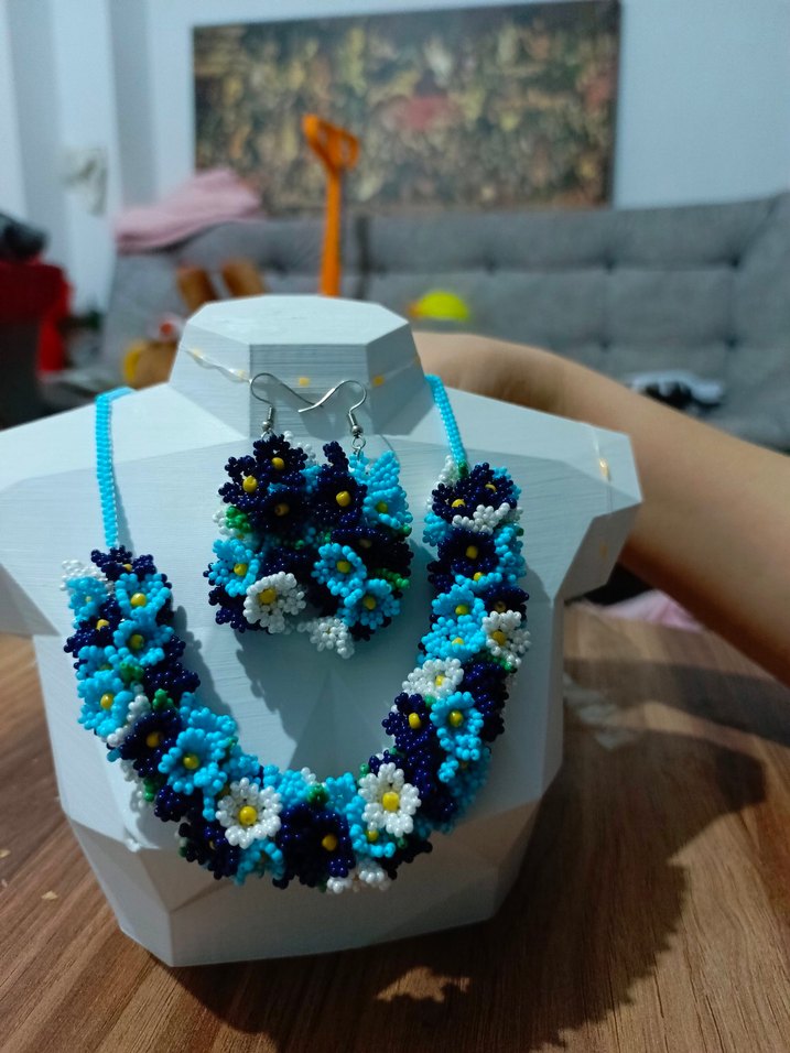 Kısa uzunlukta, mavi tonlarda renkli boncuklu çiçek desenli bohem kolye seti, uyumlu küpelerle birlikte. sipariş üzerine yapılır. 1 haftayı bulabilir. önce mesaj atıp bilgi alınız.