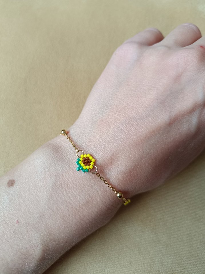 Kadın bileklik, renkli boncuklarla çiçek deseni oluşturur. İnce zincirli ve günlük kullanıma uygundur. Bohem ve minimalist tarzda. Orijinal Miyuki boncuk ve çelik metaryel kullanılmıştır. El emeği üründür.