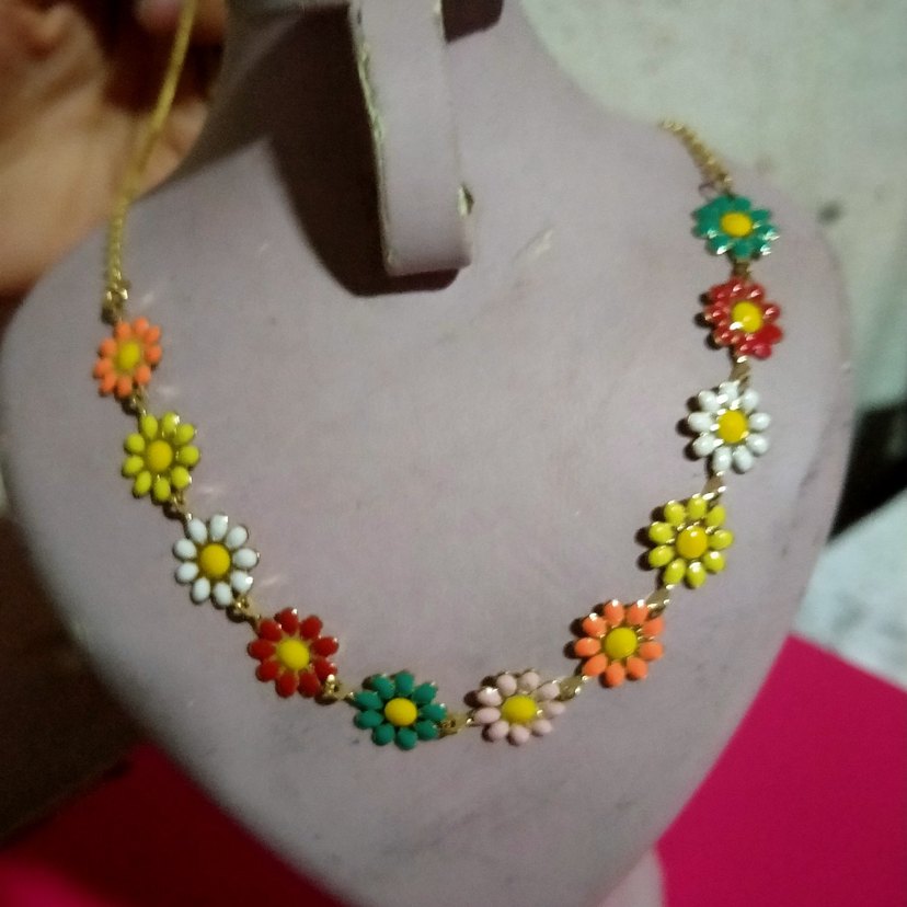 Renkli boncuklarla işlenmiş, çiçek desenli midi uzunlukta bohem tarzda parti kolyesi.