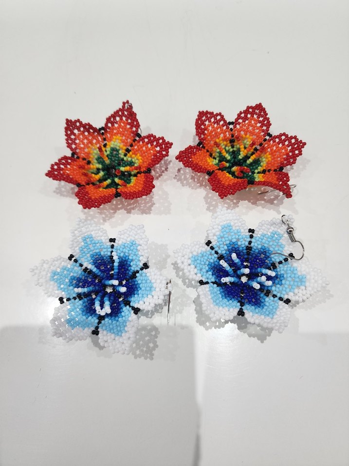 Renkli boncuklarla işlenmiş mini uzunlukta çiçek küpeler, bohem tarzda, açık hava etkinlikleri için uygun. Bir cift fiyatidir