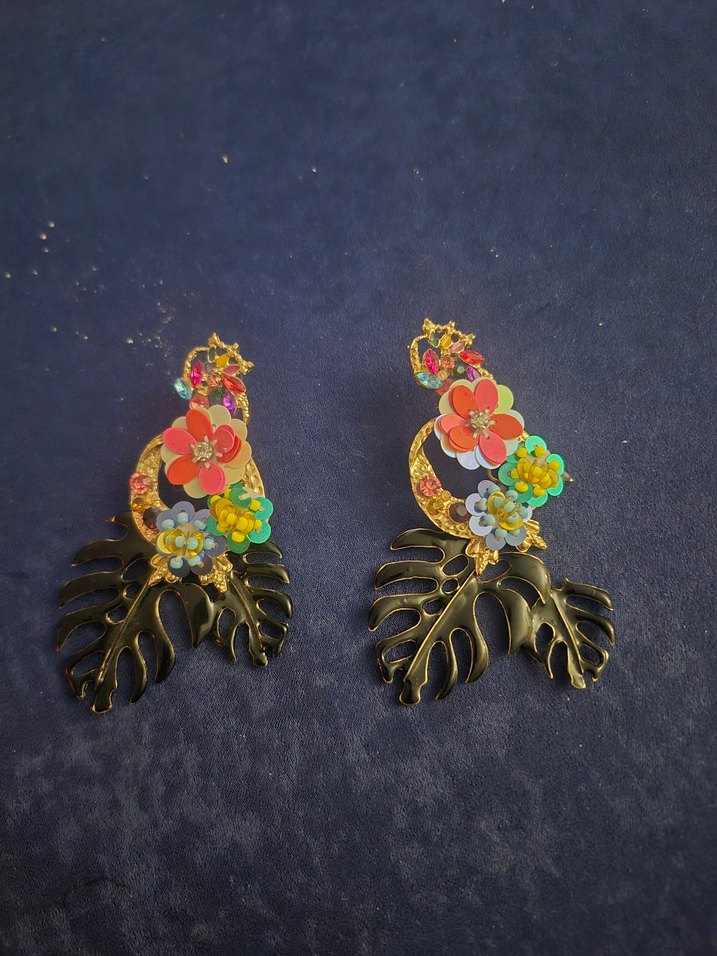 Kısa boylu bohem küpeler, renkli çiçek desenleri, boncuk detayları ve siyah yaprak süslemeleri içerir, parti için uygundur.
