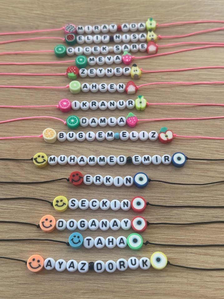 Renkli boncuklar ve işlemeli desenlerle süslenmiş, isimli çocuk bileklikleri, meyve ve gülen yüz figürleri içerir. İsme özeldir toptan alım icin yazarak fiyat sorup iletişime gecin