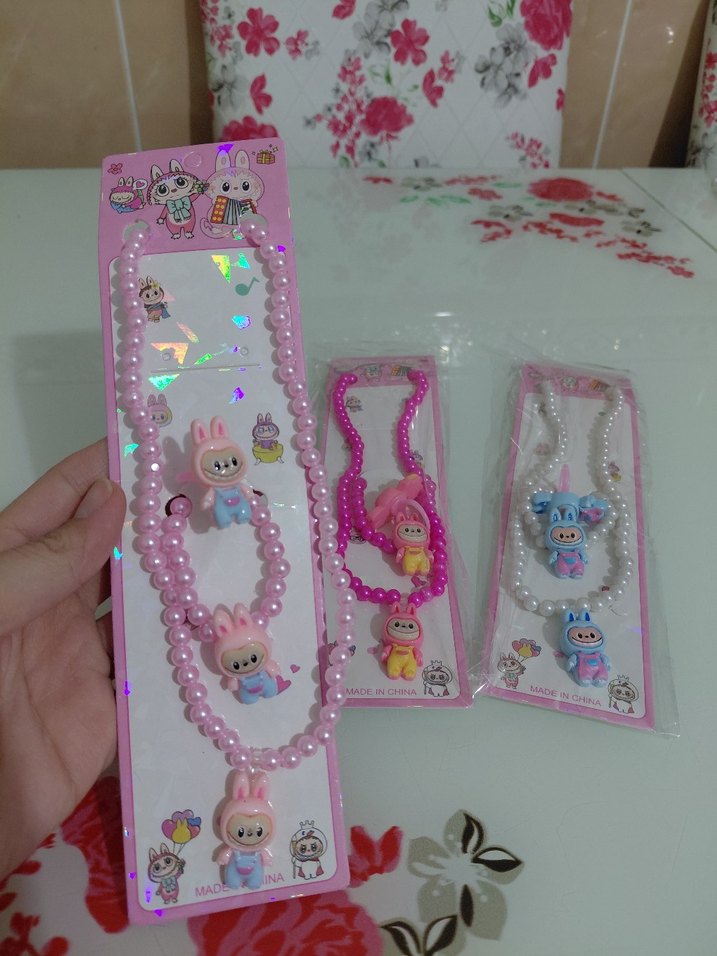 Pembe, mor ve beyaz renklerde oyuncu karakter figürlü renkli boncuklu çocuk saç aksesuarları. Bohem tarzına uygun.