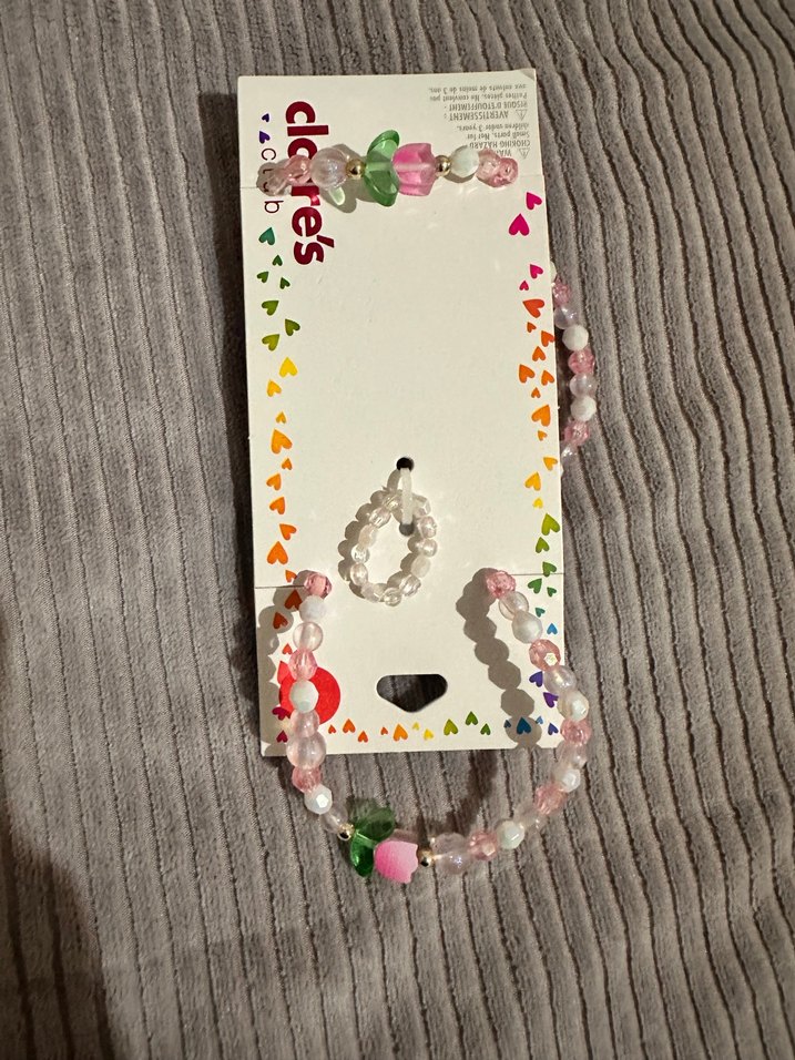 Bohem tarzda, pastel çok renkli baskılı boncuklardan oluşan çocuk kolye ve yüzük seti.