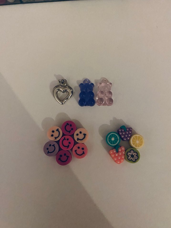 Renkli fimo boncuklar ve ayıcıklı jelibon şeklinde kolye uçları, kalpli kolye ucu meyveli boncuklar hepsinin toplam fiyatıdır