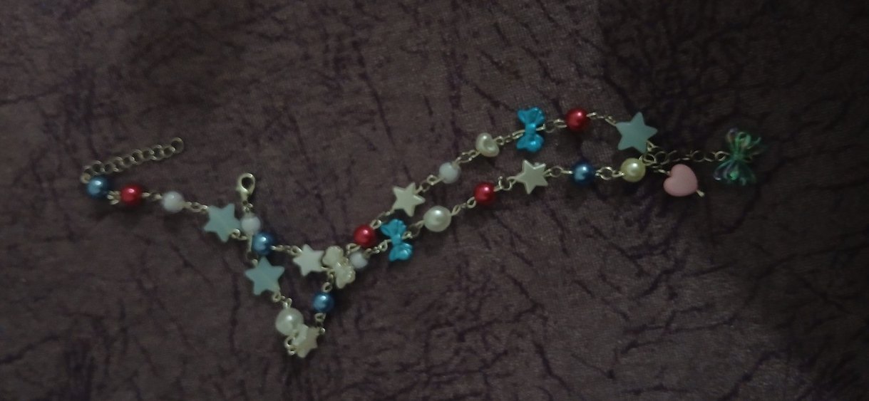 Renkli boncuklar, yıldızlar, fiyonklar ve incilerle süslenmiş bohem tarzda çocuk takısı. Nakış deseniyle retro bir görünüm sunar.
