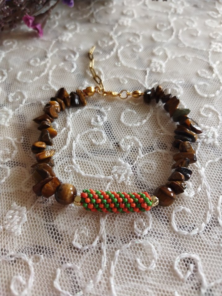 Bu bohem tarzı kadın bileklik, renkli boncuk işlemeleri ve doğal taş Kaplan gözü boncuklardan oluşur, günlük kullanıma uygundur. Ürün el yapımı olup sıfır.Marka temsilidir.