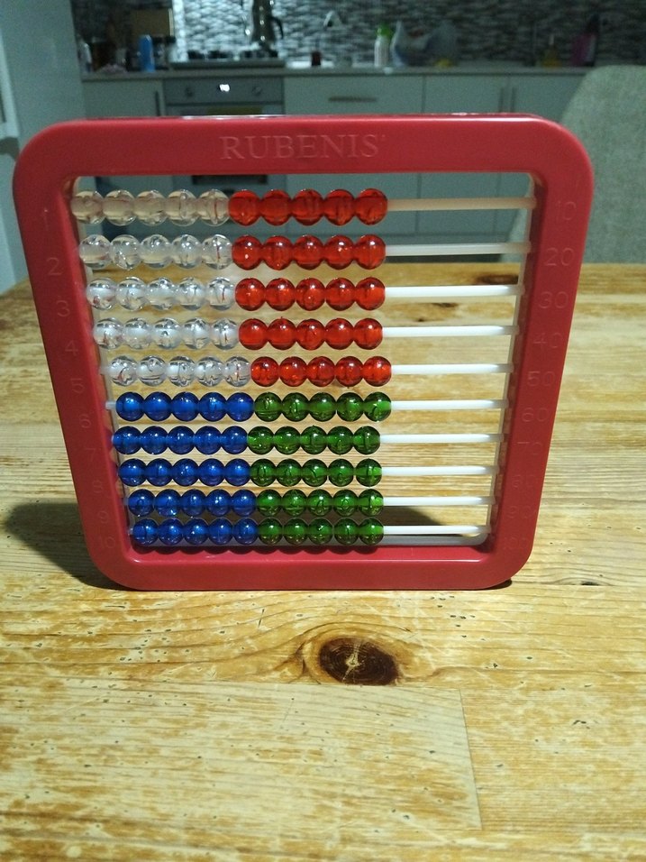 Kırmızı çerçeve içinde kırmızı, beyaz, mavi ve yeşil boncuklardan oluşan renkli abaküs. Sayma ve temel matematik becerileri için uygundur.