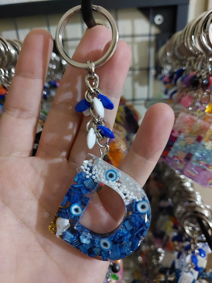 Renkli boncuklar ve dekoratif harf figürü içeren bohem tarzda anahtarlık. Canlı ve retro bir görünüm sağlar.