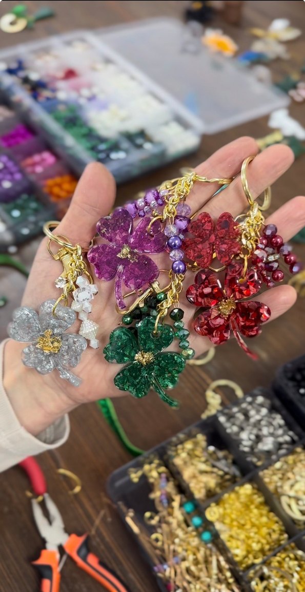 Altın tonlu detaylara sahip, bohem tarzda renkli boncuklu çiçek desenli anahtarlıklar. Anahtarlara veya çantalara gösterişli bir dokunuş katar. İstenilen modele göre yapılır