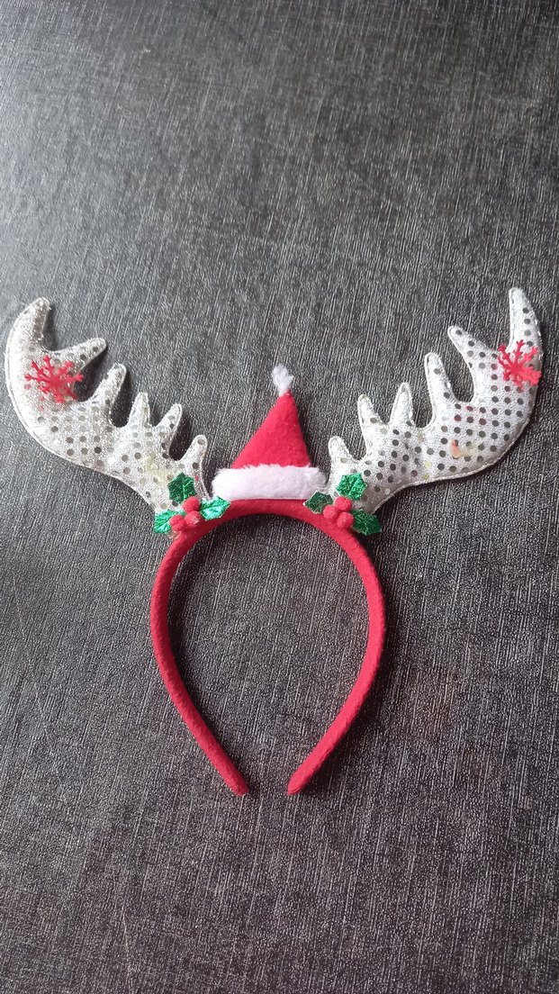 Boncuk ve nakış detaylı, renkli geyik boynuzu ve küçük kırmızı Noel şapkası ile süslenmiş saç bandı.