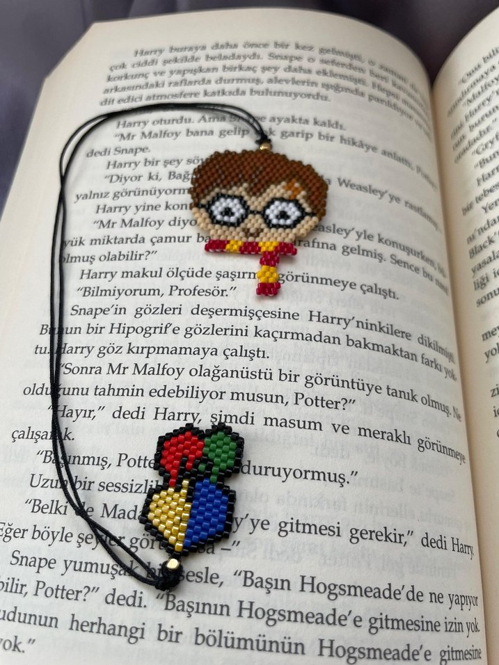 Pop kültür ve retro tarzda, renkli boncuklarla yapılmış pixel tarzı Harry Potter ve büyü kitabı figürlü kitap ayraci