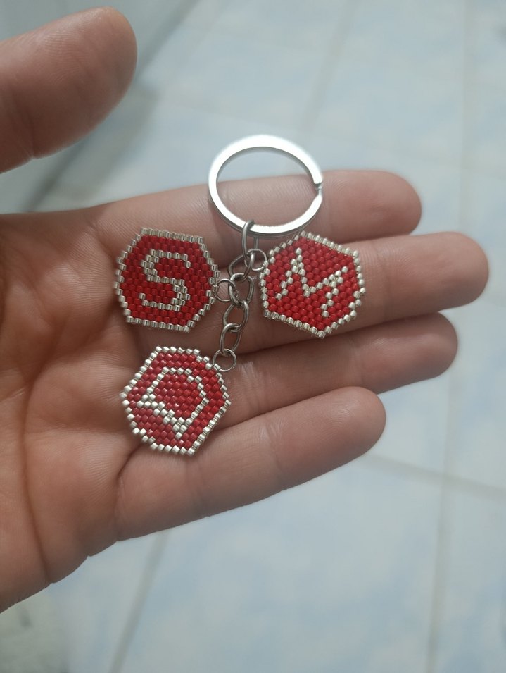 Kırmızı boncuklarla işlenmiş harfli üçgen şekilli renkli kadın anahtarlık. Bohem tarzı için uygun. istenilen harf ile yapılır