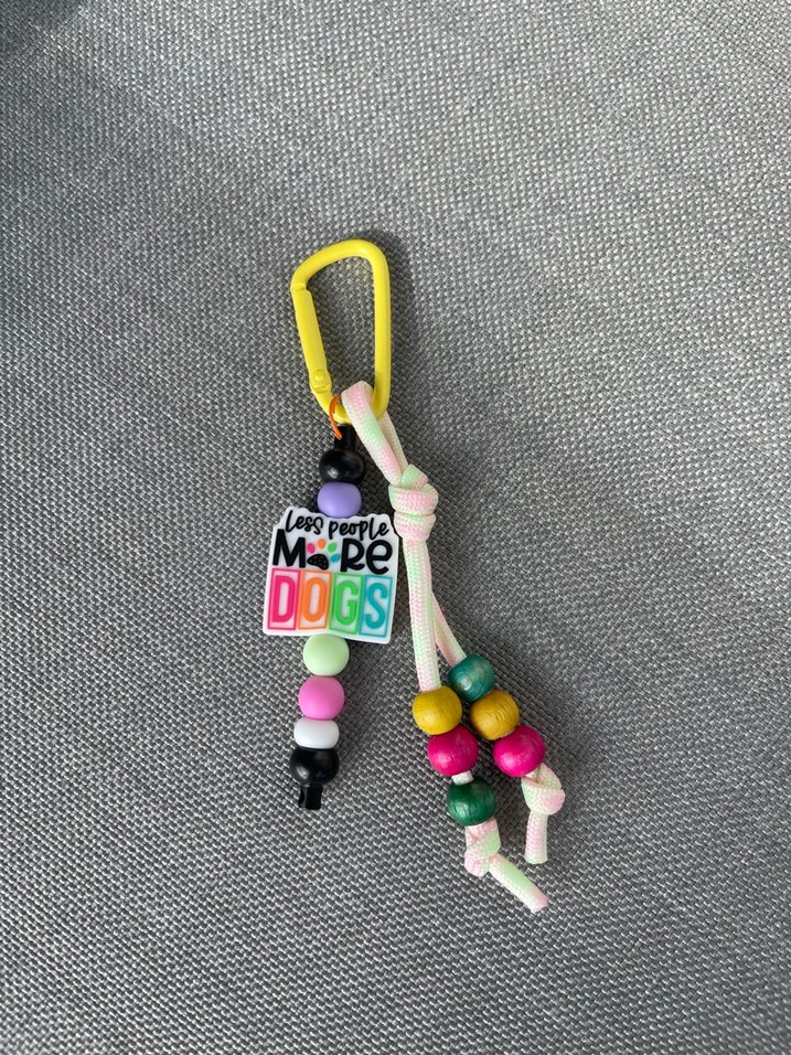 Renkli boncuklar ve mesajlı figür içeren, sarı karabina klipsli kadın anahtarlık. Bohem ve grunge punk tarzına uygundur. ️