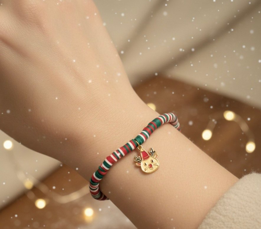 Renkli boncuklardan oluşan, çizgili desene sahip ve sevimli geyik figürlü bohem tarzda kadın bileklik.