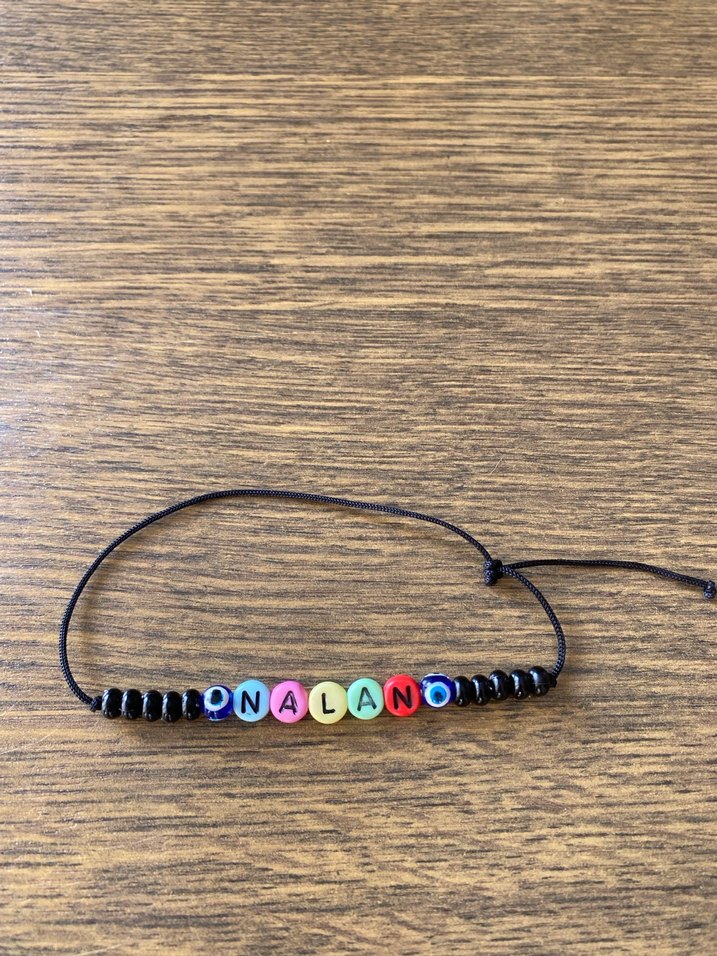 Renkli harf boncuklarının "NALAN" yazdığı, siyah küçük boncuklarla tamamlanan minimalist erkek bilekliği. Retro ve bohem tarzında.