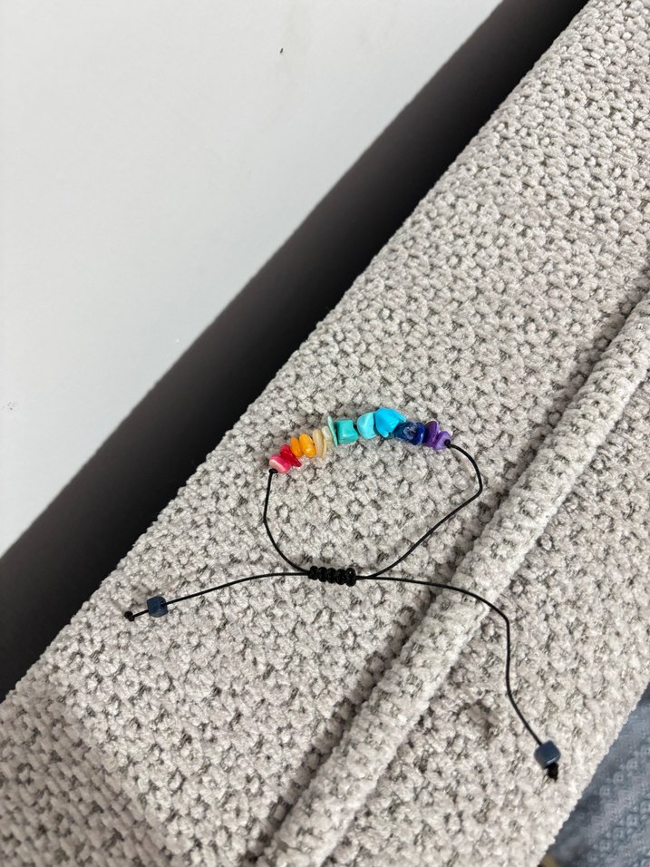 Ayarlanabilir siyah ipte, tie-dye desenli çok renkli boncuklardan oluşan bohem tarzda kadın bileklik.