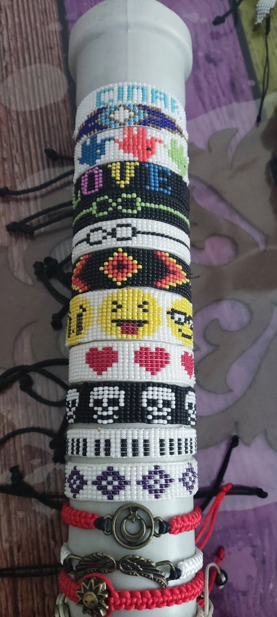 Renkli boncuklardan yapılmış, emoji, kalp ve geometrik desenler içeren, bohem ve retro tarzda kadın bileklik seti. Günlük kullanım için uygundur.
