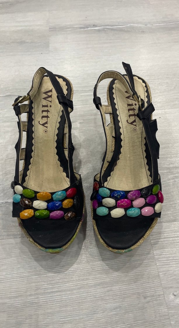Renkli boncuk detaylı, dolgu topuklu sandalet. Kauçuk malzemeden üretilmiş, çok az soyulmalar var başka sıkıntısı yok