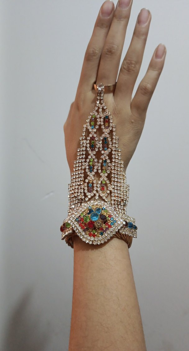 Renkli boncuklarla süslenmiş, gösterişli bohem tarzda desenli kadın el zinciri. Düğün ve retro kombinler için uygun. ✨